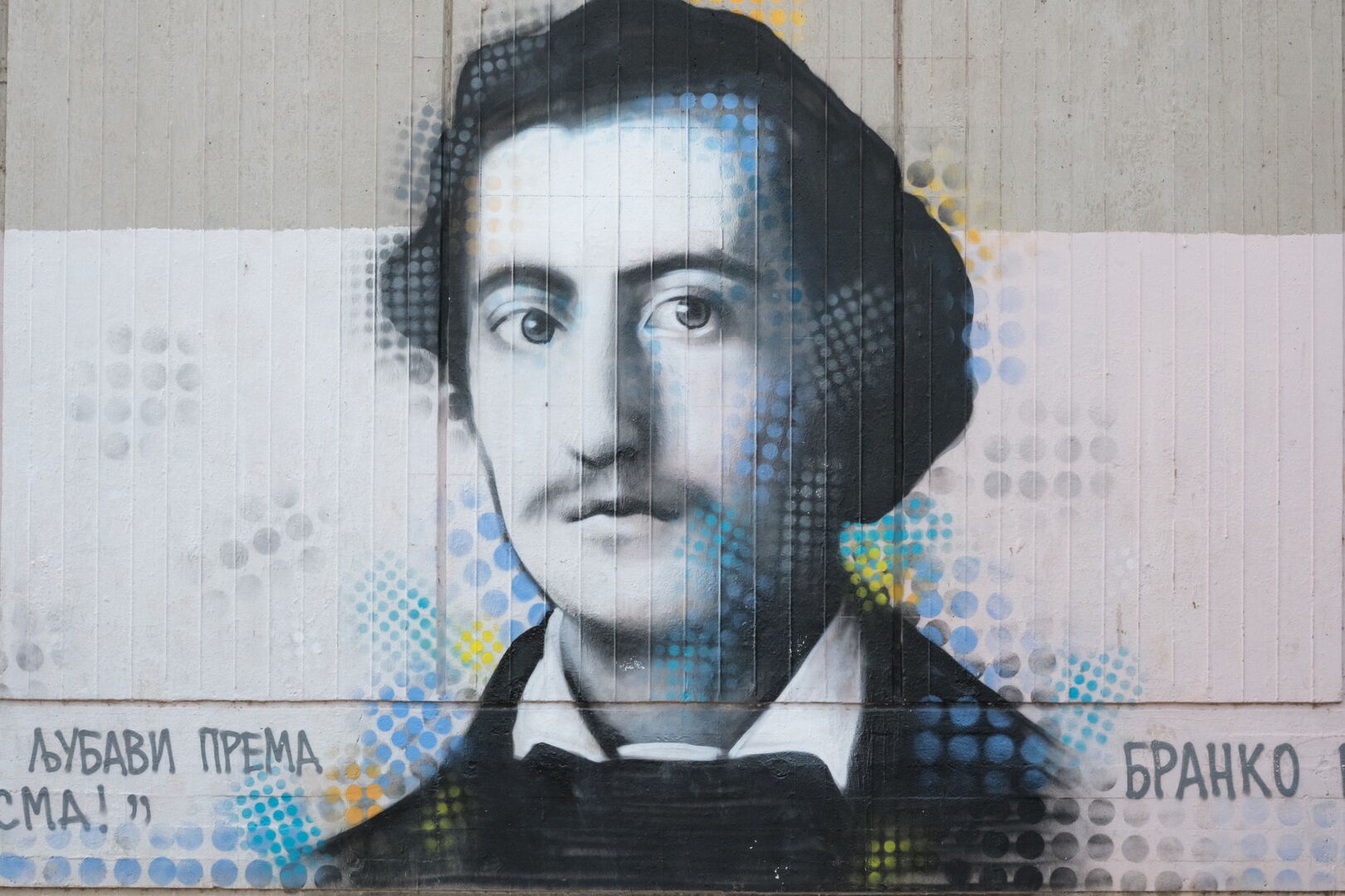 Deroks paints walls trains and other urban surfaces and treats graffiti as part of the lived city rather than something made for galleries. One of his most recognizable works in Block 45 is the portrait of Branko Radicevic on the facade of the local primary school which has become a familiar image for generations of pupils and neighbors.