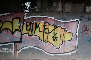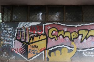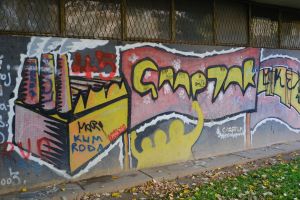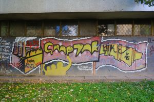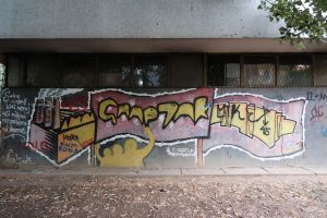 The inscription “Spartak” is executed in a outlined-letter throw-up style against a background of a flag and an indistinct factory motif. The 2003 piece is likely by AFO Crew and is documented in a FortyFivers blog and is visible on Google Maps. More details in Dayz of Glory Instagram post.