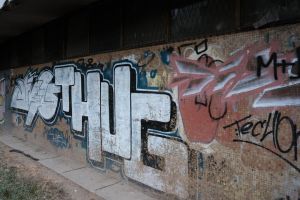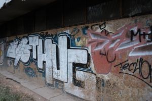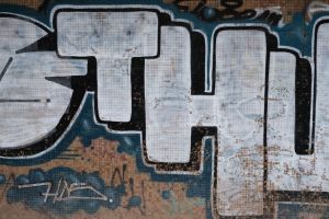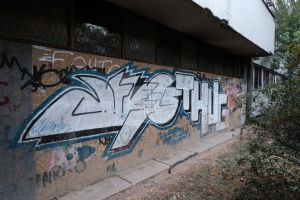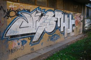 This outline piece by Maks depicts the single-word inscription “Thug” rendered in angular, outlined letters. The graffiti is visible on Google Maps, indicating that it existed no later than 2014. The work is also documented by Fortyfivers45 on Instagram.