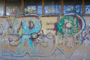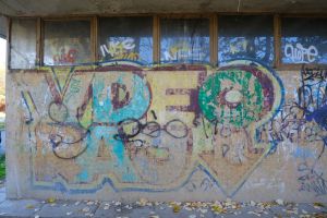 Probably the artist’s first work in the area, this 2003 piece by Nes bears the painted inscription “Vdeo Raj” rendered in block letters and is now heavily faded. Although in very poor condition it appears not to have been painted over or restored and is treated more like a memorial, and the work is documented on the FortyFivers blog and was shared by Fortyfivers45.