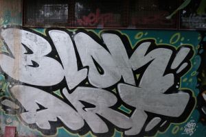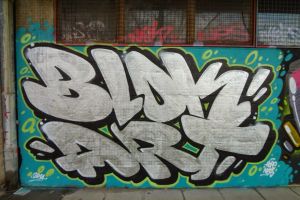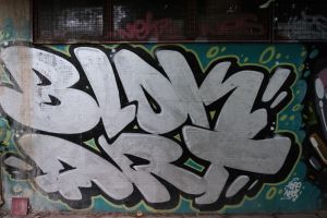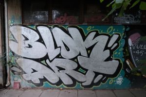 A silver-painted inscription reading “Blok Art” by Nes and Hope was created as a 2014 piece, rendered in throw-up, bubble-letter forms and presented as the name of a graffiti group. The work is documented on FortyFivers blog and shared on Fortyfivers45 on Instagram, and it is also visible on Google Maps.