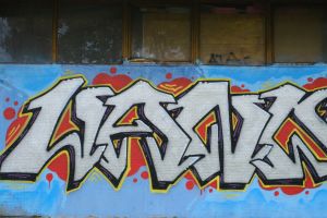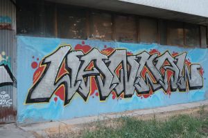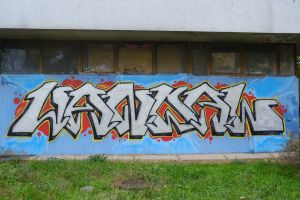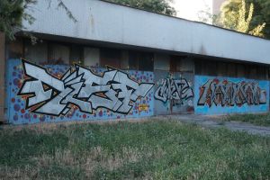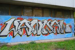 A wildstyle throw-up executed in chrome-silver letters covers an earlier mural by Moresko. The author, the painted inscription and the exact date are unknown — absence from Google Maps suggests the work was created after 2014. The compact, interlocking letters use a chrome fill that largely obscures the underlying artwork.