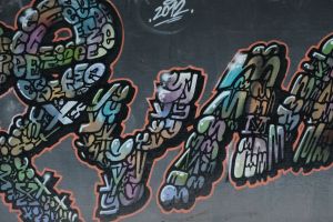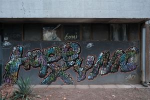 Hope and Xymo collaborated on this 2012 piece, rendered in rounded bubble letters with an unusual mosaic-style fill that gives the lettering a tessellated, textured look. The artists emphasize pattern and color inside the letterforms rather than figurative imagery. The piece is documented in a blog post.