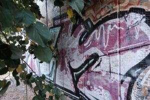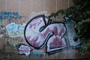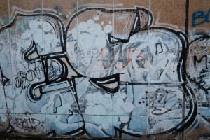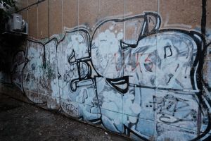 Rendered in bubble letters, this 2012 piece appears to be a collaborative work by Skalp and Dizzy, with an additional nearby tag attributed to Jens. The mural is in poor condition, which has degraded the lettering and prevents a definitive attribution of all signatures.