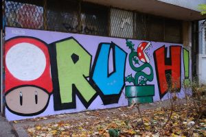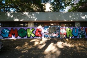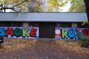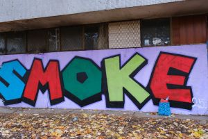 This 2025 piece by Smoke is composed of bold block letters with solid fill and a strong outline, presenting a clean, graphic lettering study. The work appears to have been executed with a probable second collaborator whose identity could not be determined.