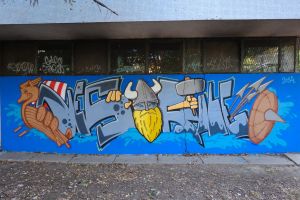 A cartoon-style Viking character dominates this 2024 piece by Nes and Rule. The composition includes a galley and a shield with spears, surrounded by the artists’ tags that frame the scene. The work is documented on the FortyFivers blog and was shared by Fortyfivers45 on Instagram.