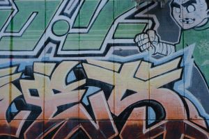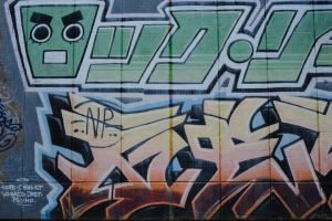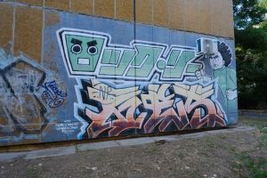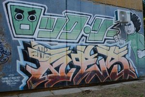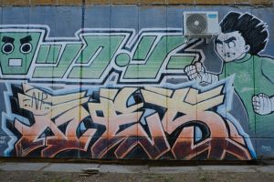 This 2012 piece by Hope, Cash, Jest, and Said is rendered in a Japanese-inspired style and depicts a dynamic fighter character. The paint has faded somewhat, but a clearer photograph is available on Google Maps. The work is also documented by Fortyfivers45 on Instagram.