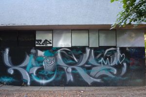 Executed in an abstract calligraffiti style, this 2015 piece by Moresko features calligraphic, abstract script forms that emphasize gestural strokes and decorative lettering. The work is documented in a photo on Streetpins and in the blog post FortyFivers blog.