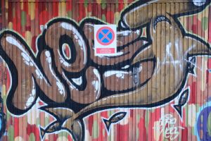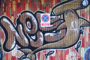 A cartoon-style hammerhead shark painted across a corrugated metal fence forms this 2014 piece by Nes and Hope. The character-driven design relies on bold outlines and flattened color to read well on the metal surface. The work was shared by before sunrise and also appears on Fortyfivers45 Instagram.