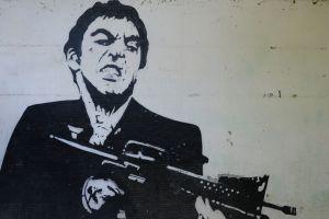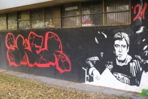 Skiv and Sker created this 2021 piece portraying Al Pacino as “Tony Montana” in a paired stencil portrait composition. The two portraits form a complementary duo rendered in a high-contrast stencil/portrait style. The work is documented by Fortyfivers45 on Instagram and also shared by before sunrise.