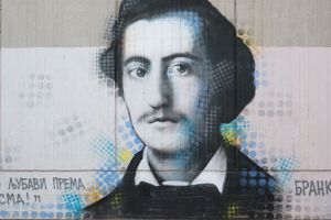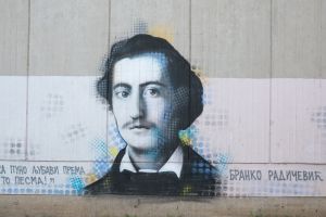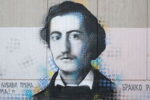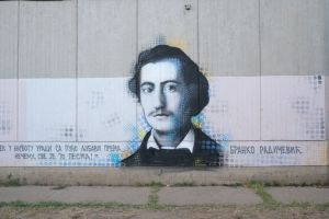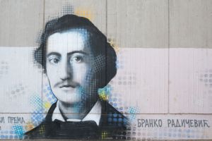 A photorealistic portrait of the Serbian poet Branko Radičević was painted in 2024 by Deroks on the façade of the elementary school that bears the poet’s name. The mural is executed in a stencil-like portrait style, emphasizing facial detail and monumentality. The work is documented on the FortyFivers blog and was shared by Fortyfivers45 on Instagram.