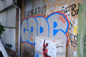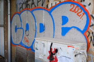 Rendered as a silver throw-up, this 2021 graffiti is attributed to Code and displays the artist’s pseudonym “Code” in rounded bubble letters. The metallic silver paint and compact, quickly executed letterforms emphasize the spontaneous, high-contrast look typical of throw-ups.
