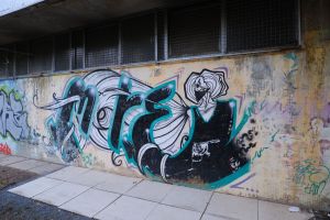 A 2012 piece by Moresko depicts an illustrative character, likely wearing a dress whose skirt deliberately forms the letter O. The work reads as a character-driven piece with simple, graphic shapes that emphasise the circular hem. The graffiti is documented on the Streetpins and is also visible on Google Maps.