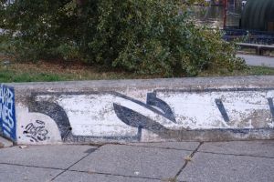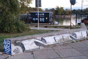 A historic 2013 piece by Jens and Nes is painted on a concrete staircase by the embankment, executed in bubble-outline letters that spell “Nine” alongside the number “45”. The work is documented on the FortyFivers blog and was shared by Fortyfivers45 on Instagram.