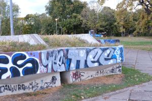 A collaborative throw-up and tag executed by Nes, Dime, Vasa, and Urke occupies the ramp leading down to the embankment. The composition is built from quick, bold lettering and overlapping tags that reveal multiple hands and rapid application. Its placement on the descent makes the work highly visible to pedestrians approaching the waterfront.