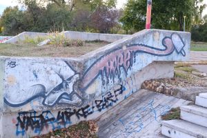 A skull-centered 2013 piece by Hope shows a skull whose tongue reaches out to lick an Eskimo-style ice lolly, painted with drips and sketchy lettering and now noticeably weathered. The work is poorly preserved on the wall but is documented with clearer photos on FortyFivers blog and was shared by Fortyfivers45 on Instagram.