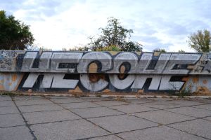 Rendered in a blockbuster, monochrome style, this 2013 piece by Nes presents the name in Cyrillic as “НЕС ОНЕ” on the descent to the waterfront. The bold, single-color letters form a straightforward typographic piece, and the work is documented on FortyFivers blog.