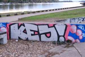 Painted in a compact throw-up and block-letter style, this 2025 piece by Vasa and Urke features the inscription “Kej” on the concrete railings of a recreational embankment, likely referencing the nearby riverside quay. The graffiti is documented by Blok Kultura.