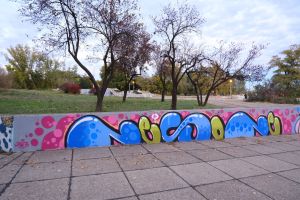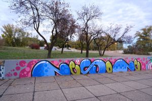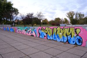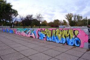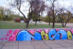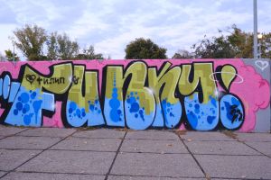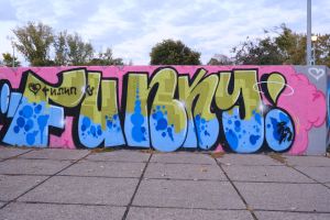 This compact collaborative 2023 piece by Nes, Junk, and Putnikus fills a stairwell landing with tight, new-school bubble lettering in bright blue on a pink background. The artists’ painted signatures “Nes”, “Junk”, and “Putnikus” appear within the limited space, giving the work a playful, cartoon-like presence. The work is documented on before sunrise.