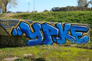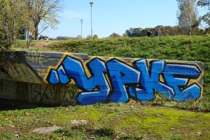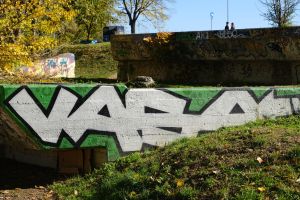 Rendered in block letters, this 2025 piece by Vasa and Urke places the painted names “Vasa” and “Urke” on different vertical levels of concrete blocks, using the brutalist surfaces to form a single cohesive composition. The two artists often collaborate, and the work is documented by Blok Kultura.