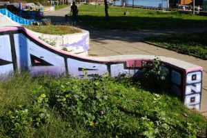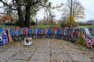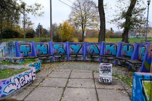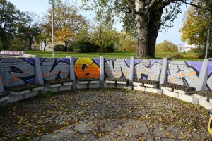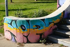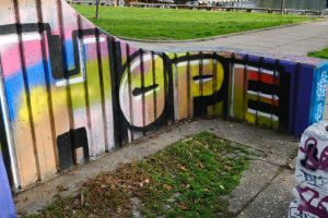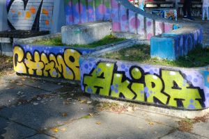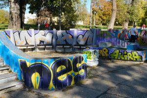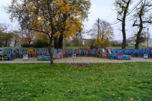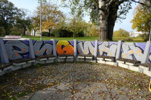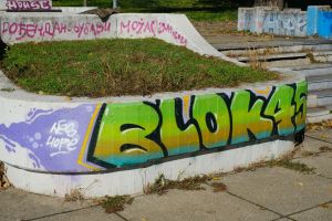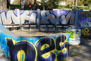 This 2023 collaborative piece by Nes, Hope and Cash covers a series of circular panels known locally as krugove on the embankment, combining block-lettered zones with throw-up style tags. The composition contains a large number of inscriptions, pseudonyms and references, with one area painted as the letters forming “тићулица”, another reading “akiroito”, and a third likely saying “original”. Photographs of the work are published on the FortyFivers blog.