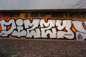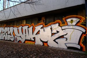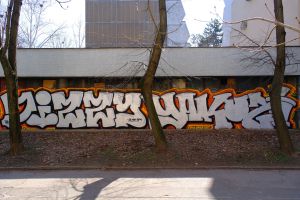 This 2026 piece likely reading “DIZZY YAKUZI” is executed in a classic silver blockbuster style. The work features chrome-filled letters with thick black outlines and a bright orange-yellow glow, creating strong contrast and high visibility across the long wall. The wide, rounded letterforms combine elements of blockbuster and bubble lettering, a common approach for large-scale graffiti pieces designed to be read from a distance. The piece covers an earlier Art #55.