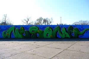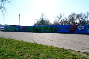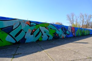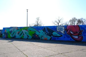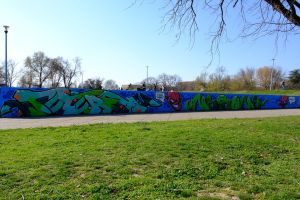 This graffiti was painted in 2026 by Nes and Hope, two writers active in the New Belgrade graffiti scene. The piece stretches along a long concrete wall and consists of large colorful lettering with a continuous blue background.