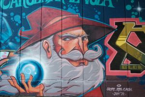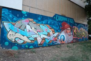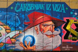 Titled “Čarobnjak iz voza” translated as “The Wizard of the Train”, this 2024 mural by Hope, Abs and Cash depicts a cartoon-style wizard character surrounded by bold lettering that incorporates the artists’ names. The work is documented by before sunrise and is also shared by Fortyfivers45.