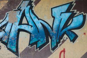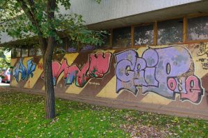 A composition of multiple graffiti is painted across a unified brown-and-yellow diagonal striped background, with bubble-style lettering that reads as a cohesive piece. The work is likely by the AFO Crew. The graffiti is visible on Google Maps, indicating that it existed no later than 2014.