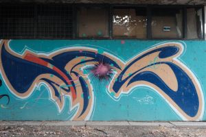 This 2019 piece by Piros, Nes and Hope is a colorful, 3D bubble-letter composition painted on a flat cyan background and lacks a bright character. The work is documented on FortyFivers blog and shared by Petar Popović on Instagram and before sunrise.