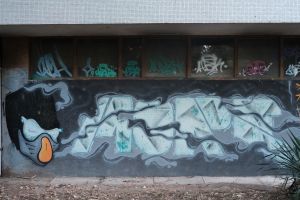 Rendered in a spare monochrome style, this 2014 graffiti by Moresko pairs abstract lettering with a small character positioned to the left of the inscription. The figure provides a visual counterpoint to the letters and helps define the composition. The work is documented on Streetpins and is visible on Google Maps.