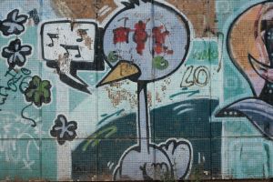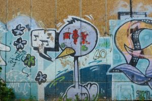 Dated to 2002, this very early graffiti attributed to Dulait centers on a cartoon-style bird character that occupies the composition’s focal point. The surrounding elements may have been added in stages and possibly by multiple authors, so overall authorship is not entirely certain. The work is documented on Fortyfivers45 and is also visible on Google Maps.