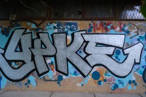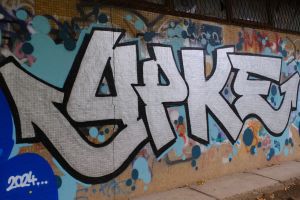 Rendered as a block throw-up in metallic silver, this 2024 piece by Urke shows the artist’s name painted in Cyrillic characters and reads as “Urke”. The work relies on bold block letters and a throw-up aesthetic, with the silver paint providing a reflective, high-contrast finish against the wall.