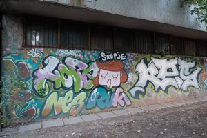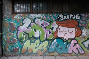 This 2012 piece by Hope, Nes, and Ruki depicts a girl character that Ruki often uses, set beside bubble-style lettering which includes the painted inscription “Skopje”. Ruki is originally from Skopje, which explains the inclusion of that word on the wall. The work is documented on before sunrise and is also shared by Fortyfivers45.