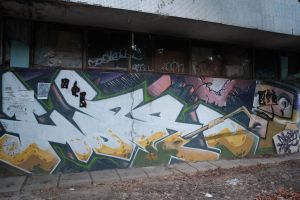 A photorealistic 2012 piece by Hope presents the painted word “hope” together with a small character whose eyes and mouth are clearly visible. The graffiti is visible on Google Maps and is documented in online posts such as Fortyfivers45 on Instagram and Walls of Belgrade.